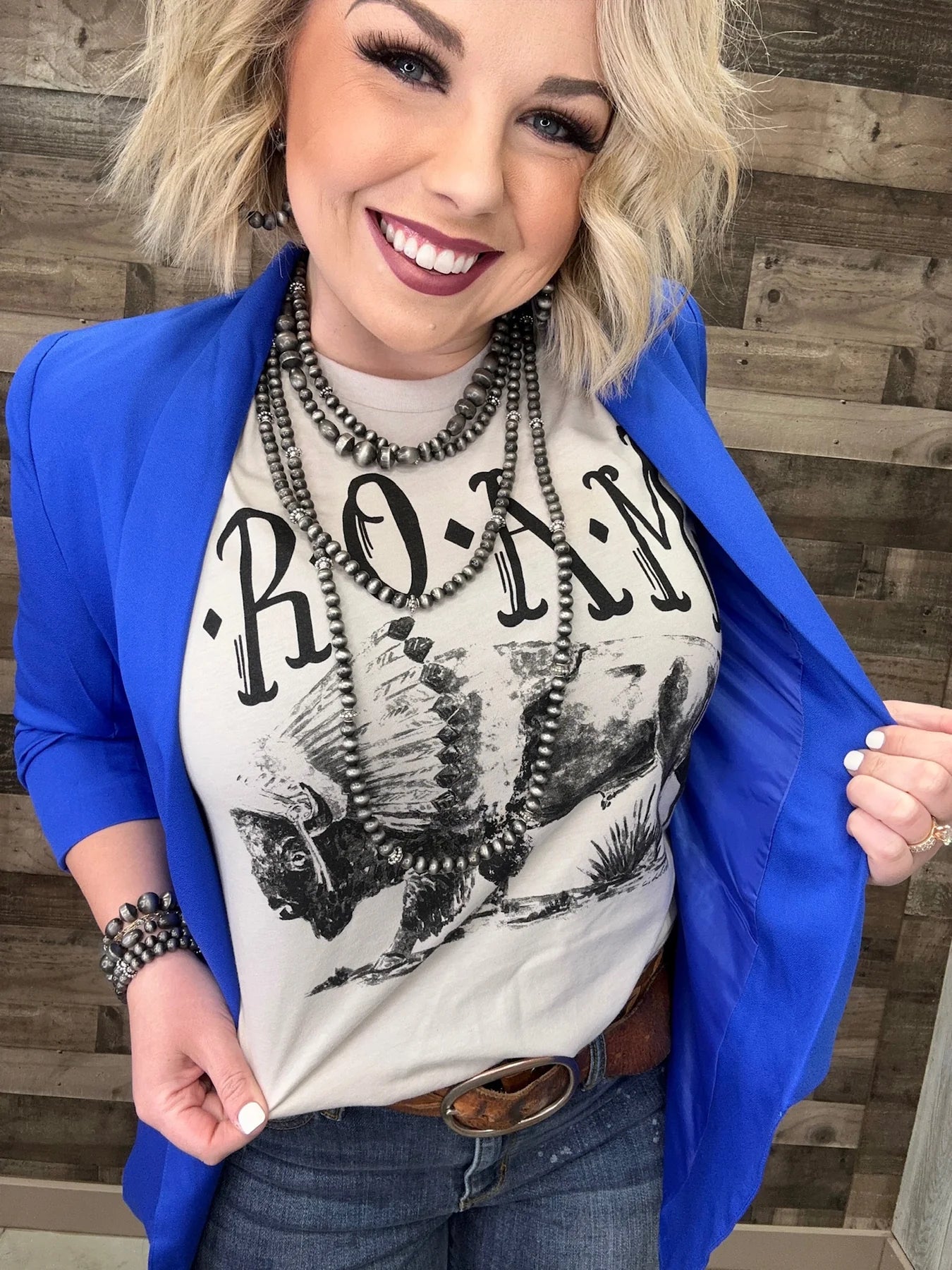 We love this buffalo ROAM, graphic tee. Hand painted design in black ink on stonewash green bella canvas t-shirt.